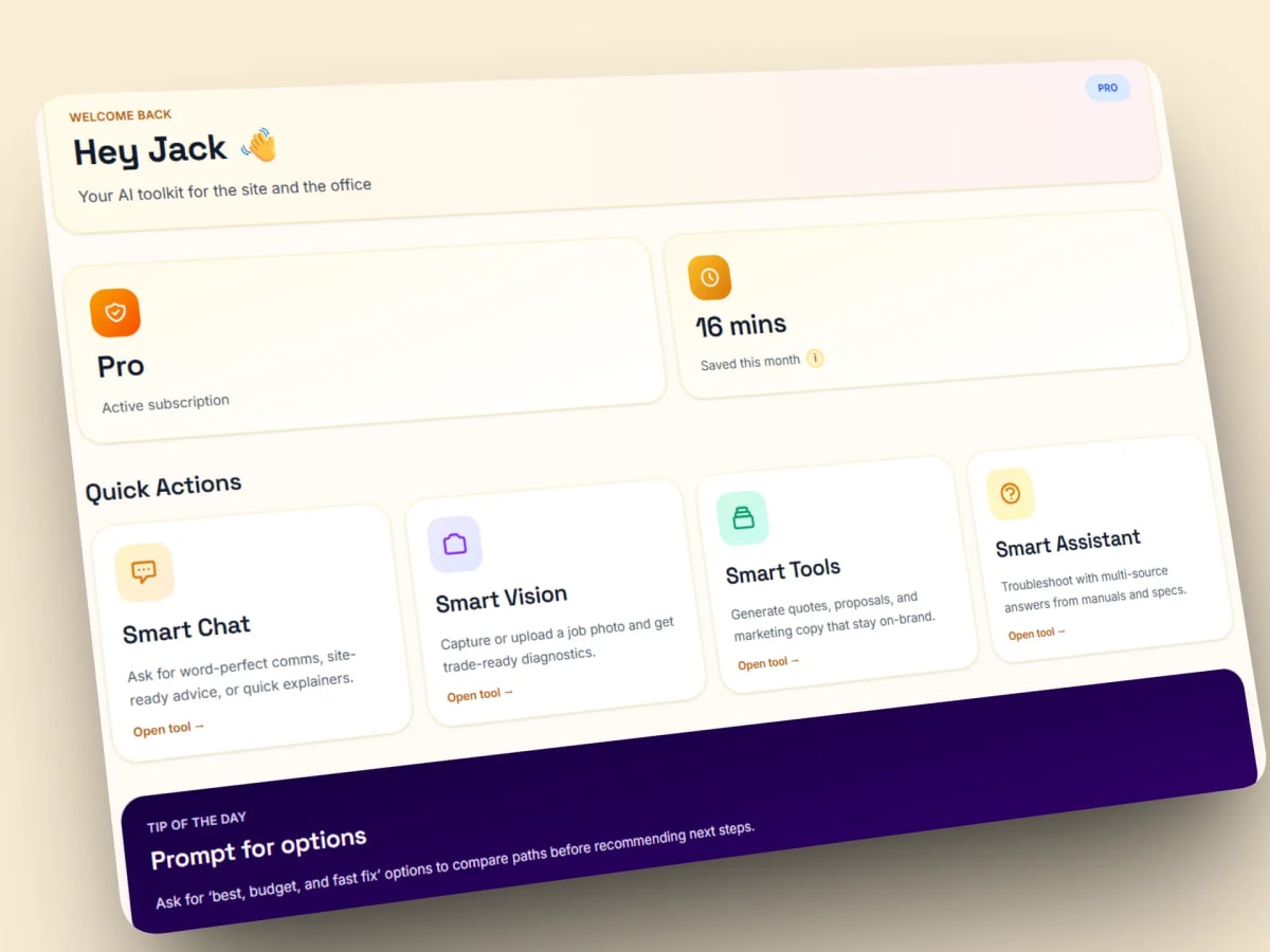 AI-powered toolkit for Aussie tradies – troubleshoot from Australian Standards and manufacturer manuals, diagnose faults from photos, and draft quotes in minutes. Upgrade when it starts paying for itself.